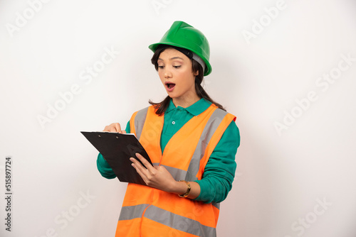 © rastockinc, Fototapeta premium Shocked female industrial engineer in uniform with clipboard on white background
