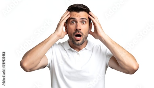 © Puasa, Naklejka premium Shocked man with hands on head, and white background.