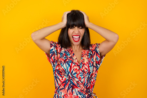 © Jihan, Fototapeta premium Shocked panic Caucasian girl dressed in stylish clothing holding hands on head and screaming in despair and frustration while being late for plane, her eyes full of terror, mouth dropped open