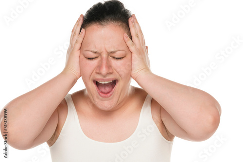 © vladimirfloyd, Naklejka premium Shocked panic young chubby caucasian woman over white background holding hands on head and screaming