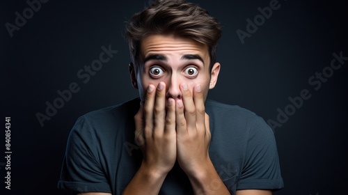 Fototapeta premium shocked photo The shocked young man covered his mouth excitedly