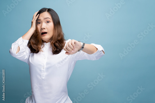 Fototapeta premium Shocked woman holding hand with wrist watch isolated on a blue background