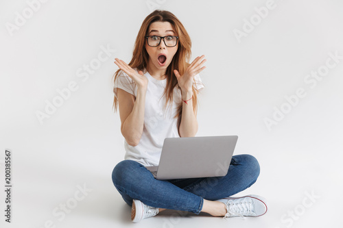 © Drobot Dean, Naklejka premium Shocked woman in t-shirt and eyeglasses sitting on the floor