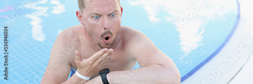 Obraz premium Shocked young man in the pool looks into a laptop