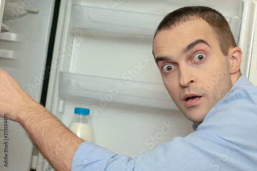 © Анастасия Семашко, Fototapeta premium Shocked young man looking for food in the refrigerator, side view