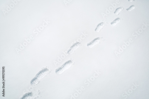 Obraz premium Shoe prints in fresh snow on snowy city street.