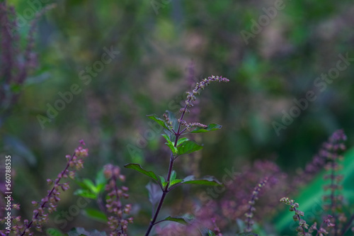 © Pornprasit Panada, Fototapeta premium Shoots and flowers of black basil, non-toxic
