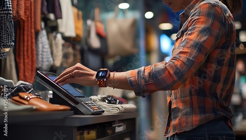Naklejka premium Shop Owner Using Smartwatch for Payment in Stylish Boutique