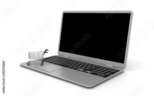 Fototapeta premium Shoping cart 3d render. Blue background. Modern store. Blue shoping cart....