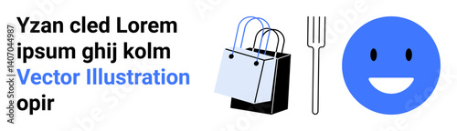 Fototapeta premium Shopping bag, smiling blue face, fork symbolizing retail, dining, satisfaction and lifestyle. Ideal for commerce, customer satisfaction, business, dining e-commerce shopping leisure flat landing