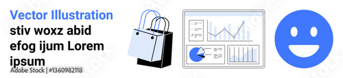 Fototapeta premium Shopping bags, data charts with graphs, and a smiling emotion. Ideal for e-commerce, retail analysis, customer satisfaction, online shopping, business trends, marketing strategies flat landing page