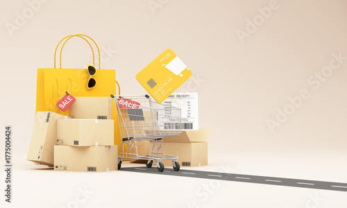 Obraz premium Shopping bags sale tag and shopping cart next to shipping boxes show the...