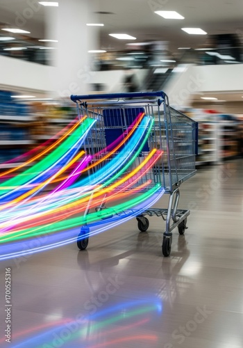 © Aryazu, Obraz premium Shopping cart with vibrant colorful light trails in a store.