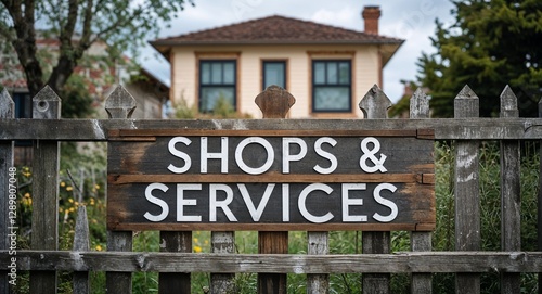 © Erlinda, Obraz premium Shops and Services lettering on sign at fence with house background