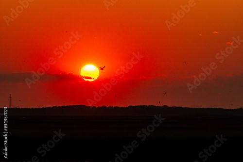 Obraz premium Shore Birds flying in the salt marsh in between Avalon, New Jersey and the Cape May National Wildlife Refuge at Sunset or golden hour