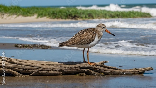 © AmuvitaGamage, Obraz premium Shorebird Perched on Driftwood with Wings Spread, Embracing the Ocean Breeze