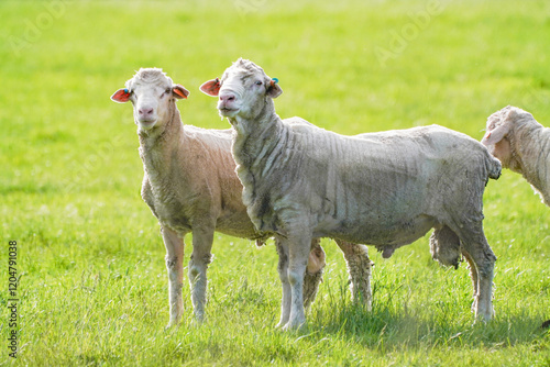 © Katherine, Obraz premium Shorn Sheep Standing in a Green Pasture on a Sunny Day