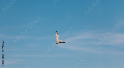 Obraz premium Short eared owl in flight against blue sky
