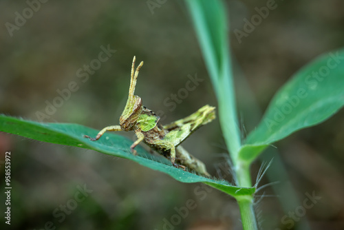 Obraz premium short horned grasshopper perched on green grass