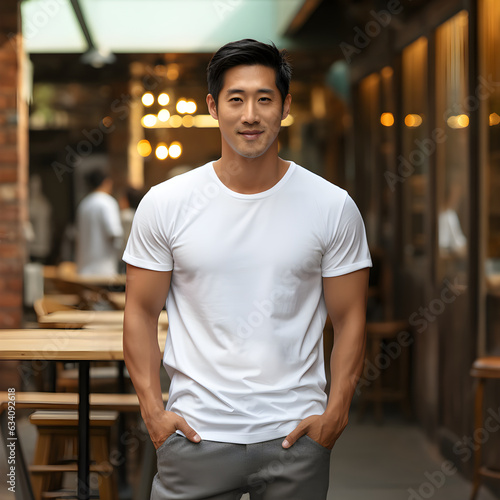 Fototapeta premium Short Sleeve White Tee Mockup Asian Model Confident Look