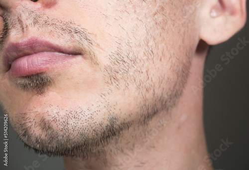 © Vadym, Fototapeta premium Short, sparse beard on mans face. Hair growth problems. Man with alopecia area in the beard. Unshaven bristles on the beard.