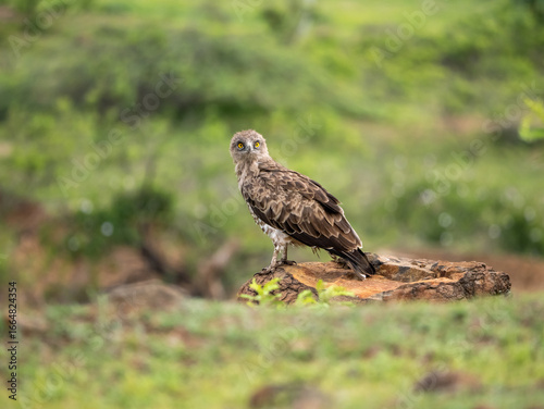 © Sumant, Obraz premium Short-toed Snake Eagle perched on rock in lush green Indian landscape