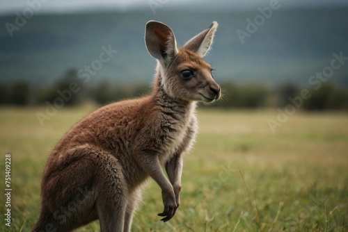 Fototapeta premium Shot of a baby kangaroo standing on a grassy field with a blurred background