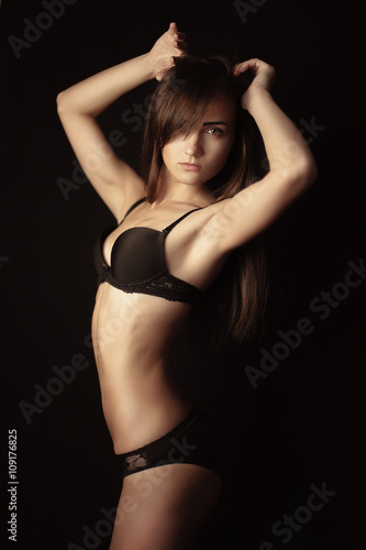© dashamuller, Obraz premium Shot of a sexy woman in black lingerie over black background.