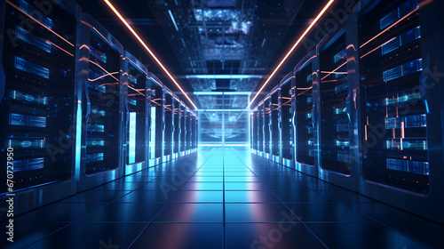 © Alvin Harambašić, Fototapeta premium Shot of Data Center With Multiple Rows of Fully Operational Server Racks. Modern Telecommunications, Cloud Computing, Artificial Intelligence, Database, Super Computer Technology Concept.