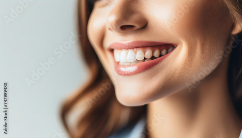 Obraz premium shot of flawless white teeth, sleeveless Caucasian woman, symbolizing beauty...