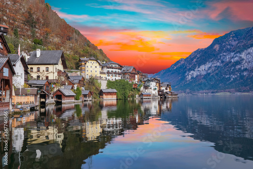 © Arnold, Fototapeta premium Shot of Hallstatt village from lake surface in Austria