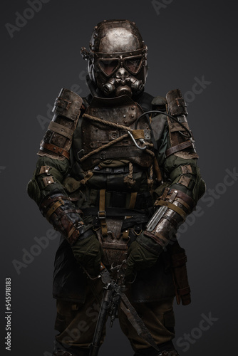 © Fxquadro, Naklejka premium Shot of isolated on grey background soldier in setting of post apocalypse looking at camera.