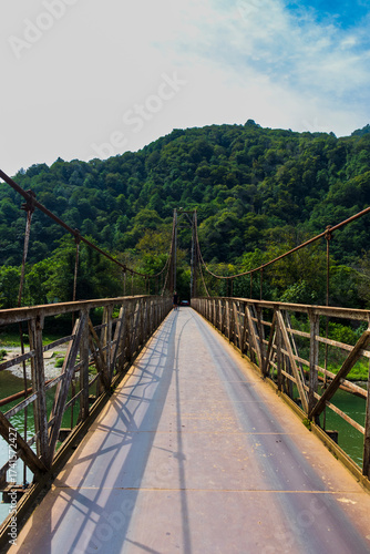 Obraz premium Shot of the suspension bridge in the mountains. Objects