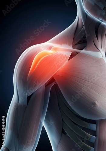 Fototapeta premium Shoulder joint showcasing red-highlighted inflammation zone for medical...