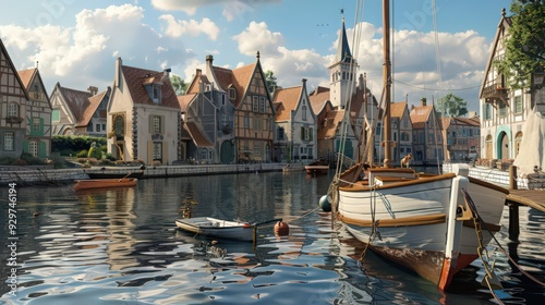 © Thirawat, Fototapeta premium Show a sailboat docked at a quaint seaside village, with charming buildings and cobblestone streets visible in the background