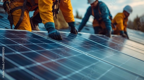 Fototapeta premium Show a team installing solar panels on a rooftop, highlighting the adoption of renewable energy sources for a greener future