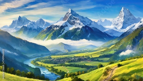 Fototapeta premium Showcase a panoramic view of snow-capped mountain peaks against a vibrant...
