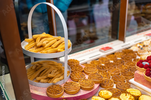 Fototapeta premium Showcase with various products for breakfast and typical churros from Madrid,...