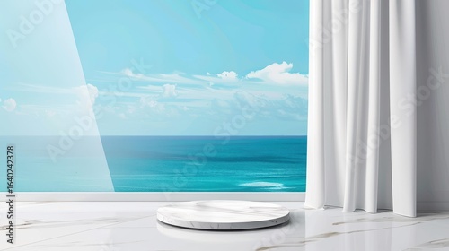 Fototapeta premium Showcase your products with a stunning white marble podium that perfectly frames a breathtaking sea view in the background.