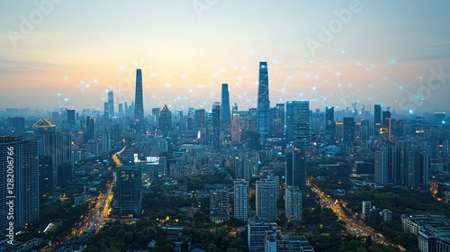 © Sakonwan, Obraz premium Showcasing advanced urban technology and global communication networks