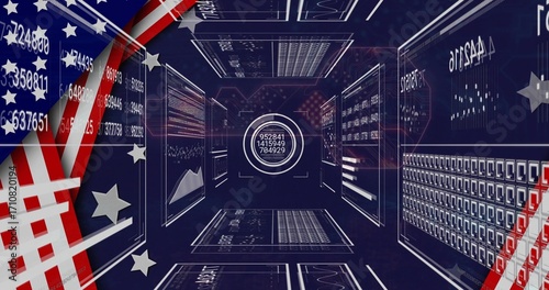 Obraz premium Showcasing data streaming charts and round display in virtual tunnel with panels and stars stripes