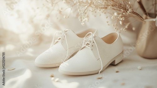 © ntpscl, Obraz premium Showcasing Elegant White Shoes Soft Textured Surface Product Photography Cozy Atmosphere Close-Up Fashion Excellence