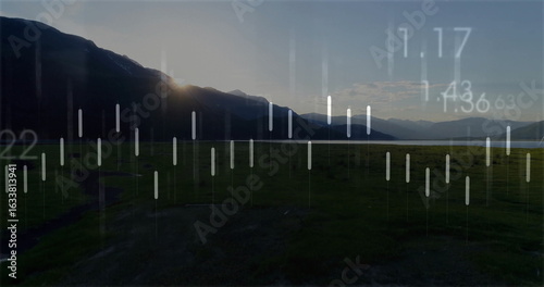 Obraz premium Showcasing grassy meadow, lake in mountain valley at dusk, with white chart bars and numeric info