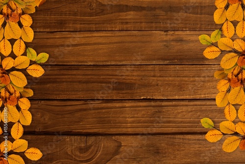 Obraz premium Showcasing rustic wooden plank surface with autumn leaf clusters framing sides in flat design