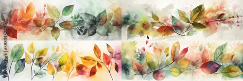 Fototapeta premium Showcasing the stunning colors of autumn, the homepage banner features four frames of 10:3 ratio, each showcasing delicate illustrations and textures of autumn leaves. Generative AI