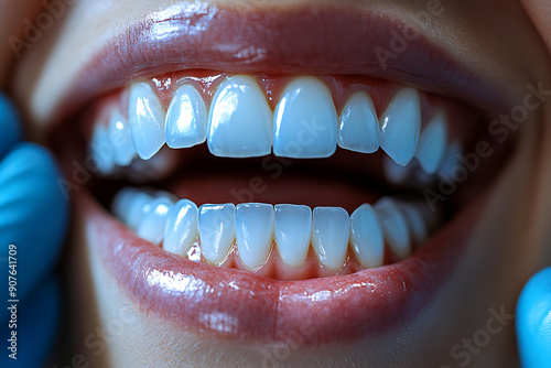 © Evhen Pylypchuk, Fototapeta premium Showing a fantastic close-up smile with perfectly white, straight teeth, radiating confidence and happiness during a dental visit