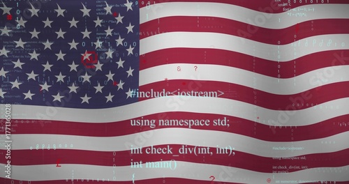 Naklejka premium Showing American flag waving in abstract digital graphic, with floating C++ code and binary digits