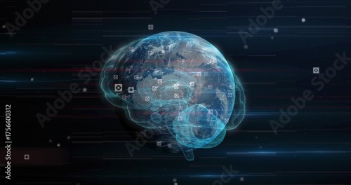 Fototapeta premium Showing brain shaped overlay wrapping around Earth globe in digital space with floating data icons