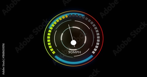 Naklejka premium Showing centered digital circular gauge with needle, white pivot, multicolor ring on black, 90MPH