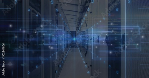 Fototapeta premium Showing central aisle extending inside data center, with server racks, holographic overlays, LEDs